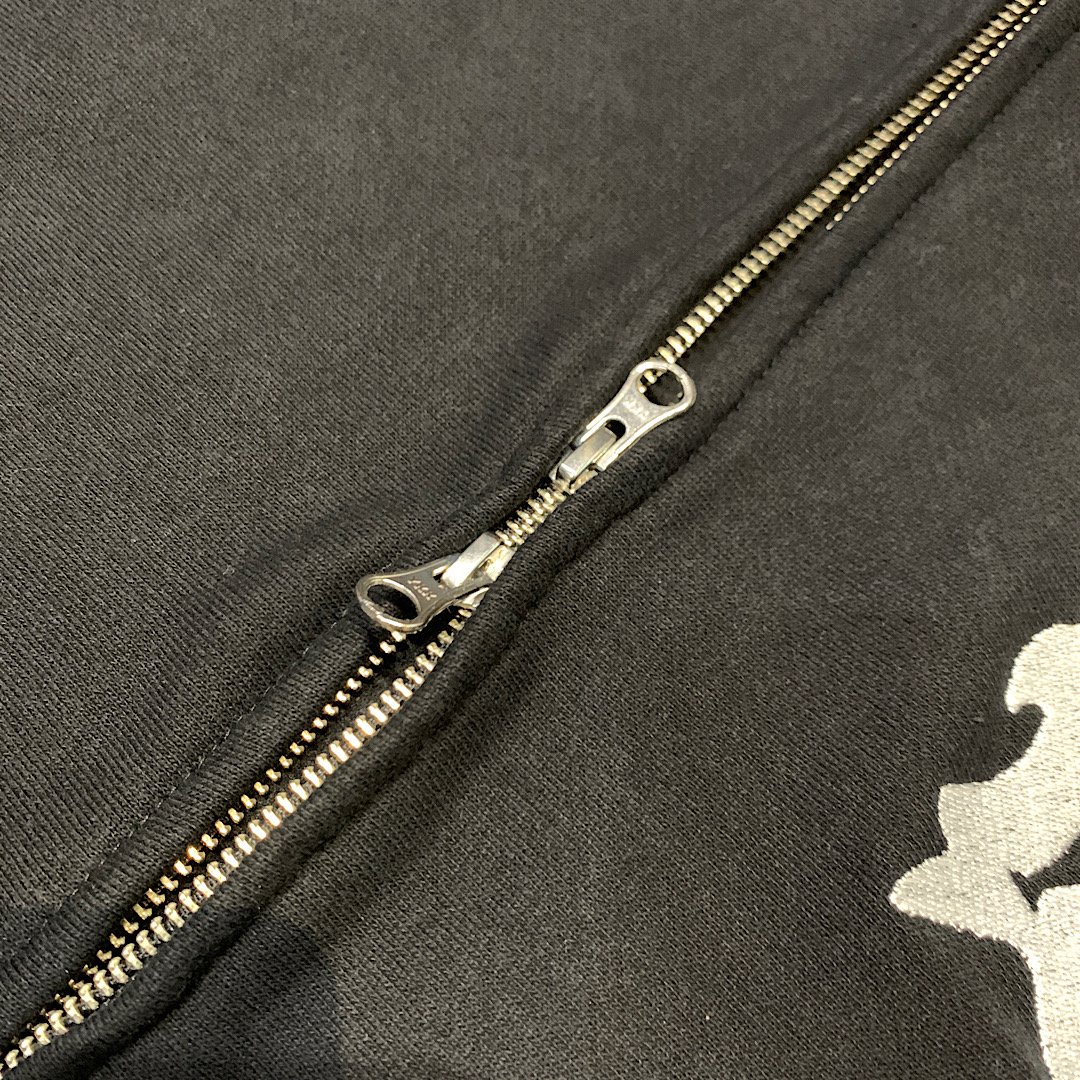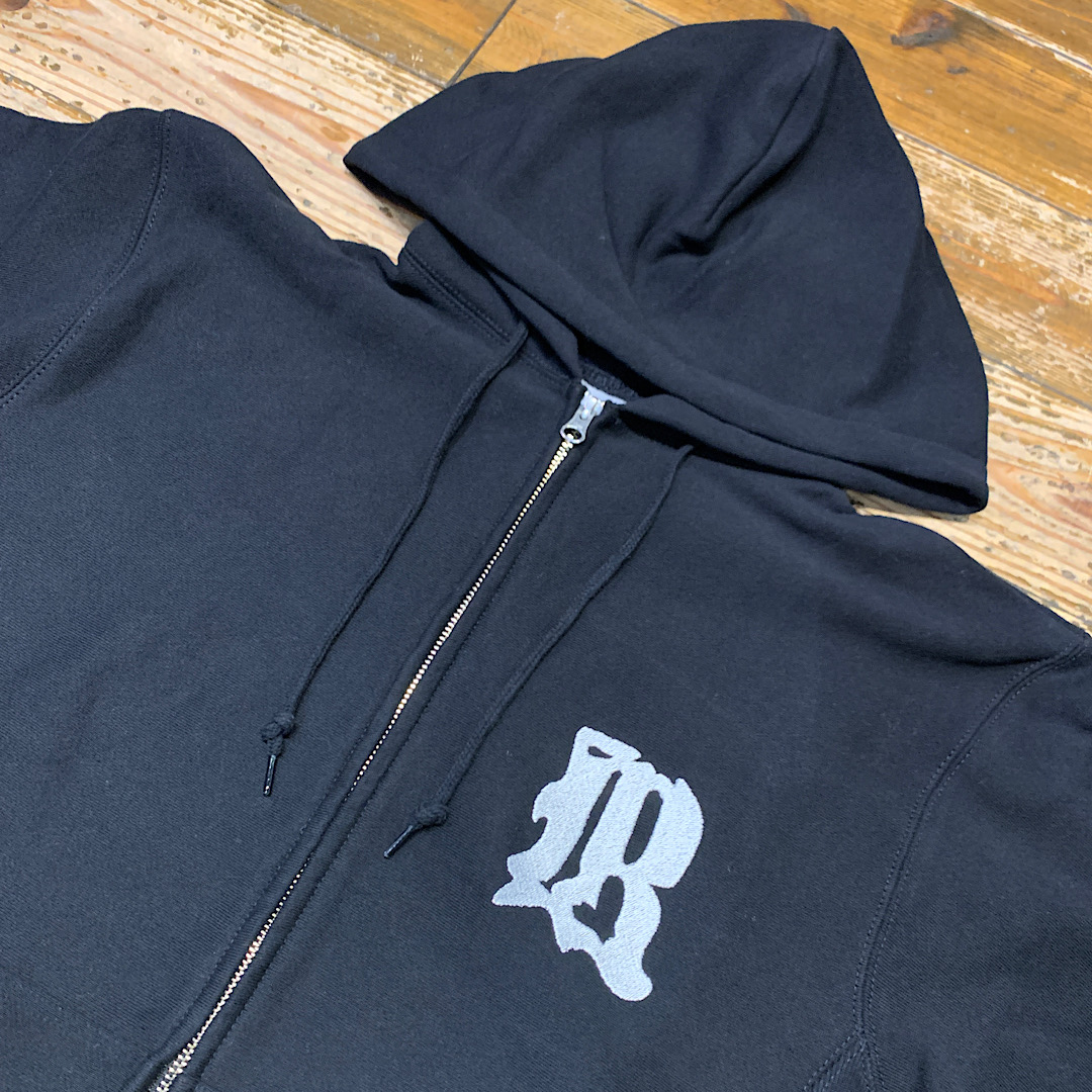 12オンスヘビーウエイトボディーで脇はサイドパネル、ダブルジップで着まわしやすいジップフードです。