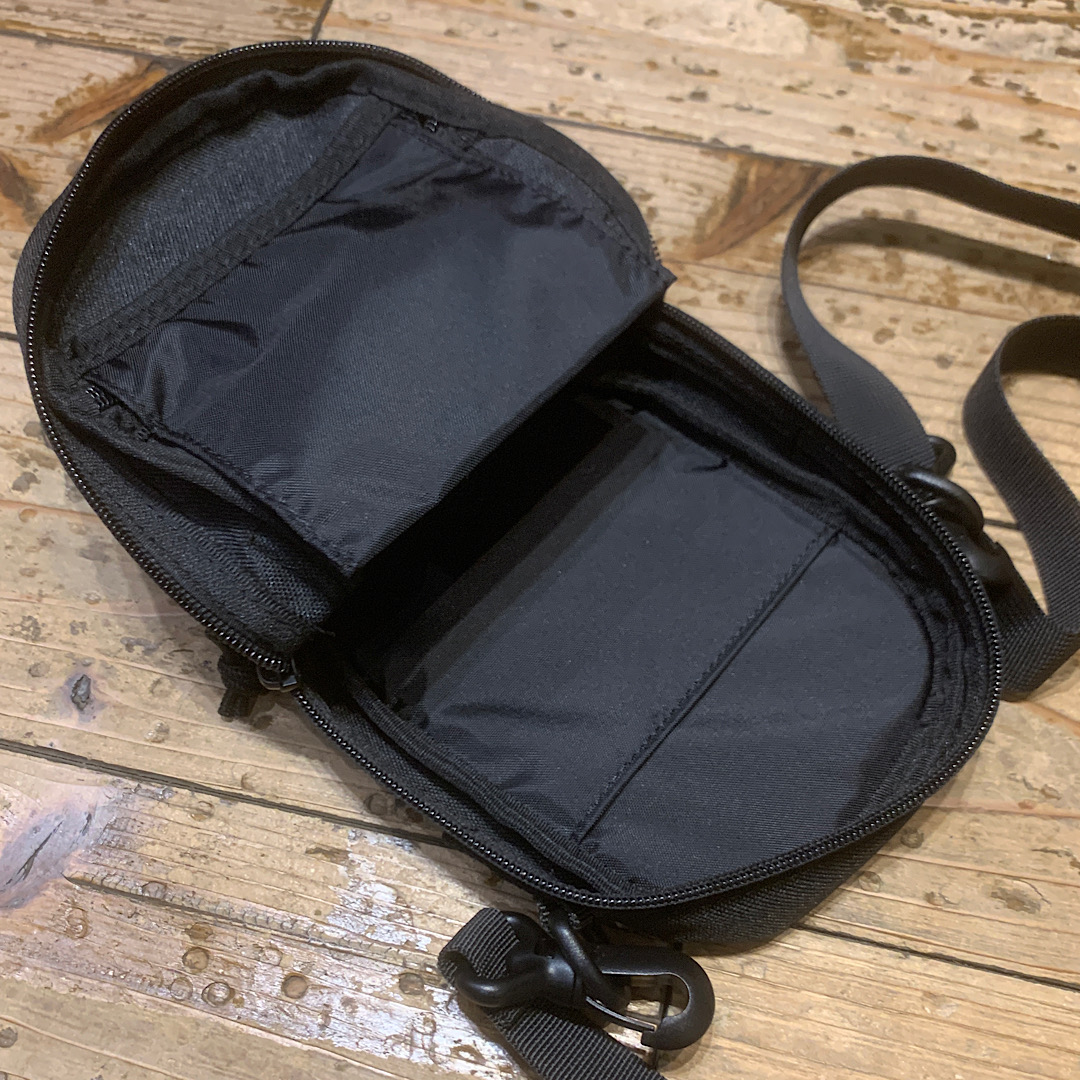 900デニールポリエステル生地を採用し、スマートフォンと財布などが収まる使い勝手の良いサイズ感のポーチです。