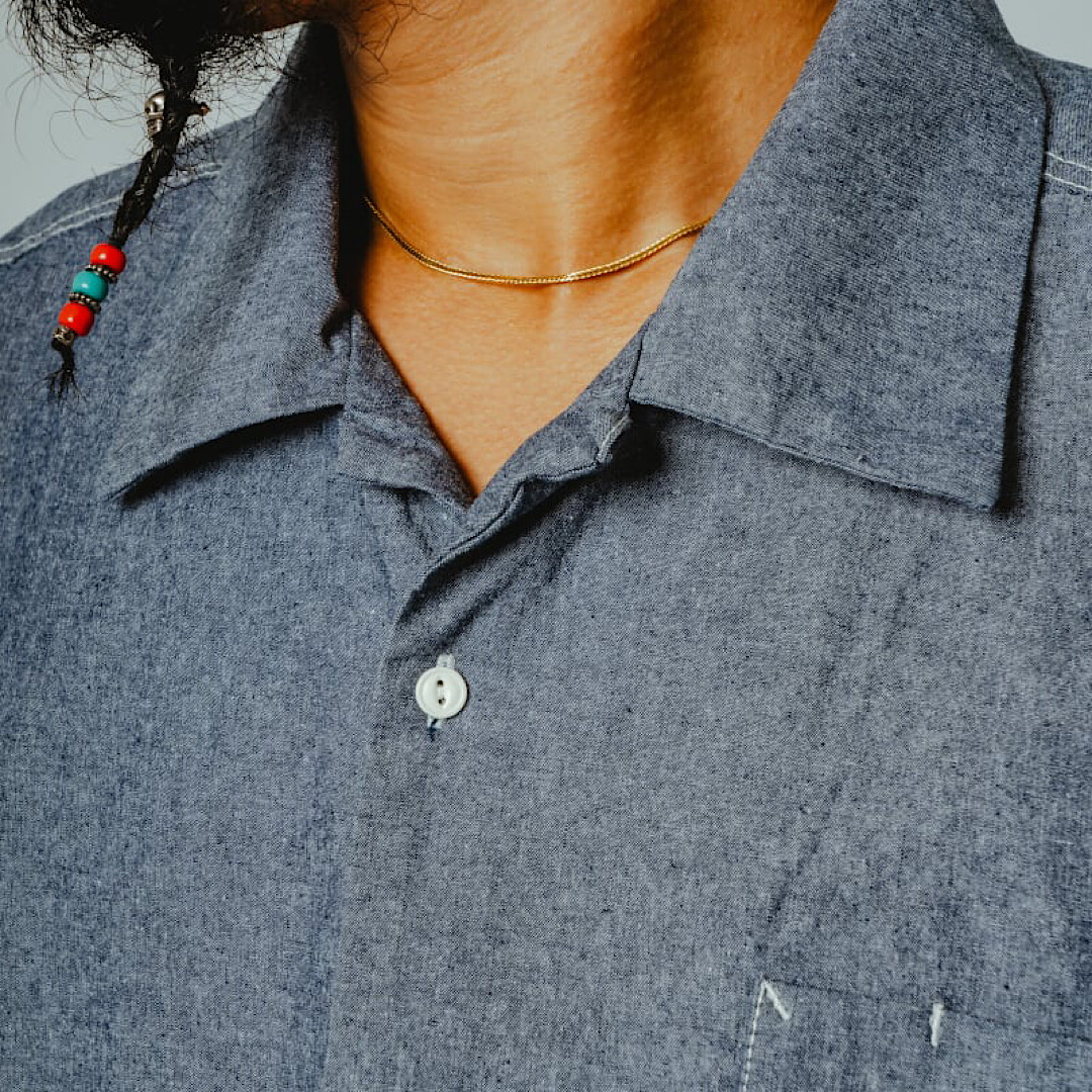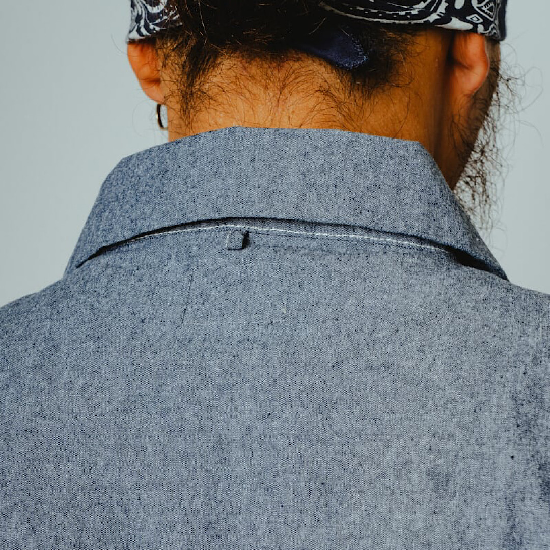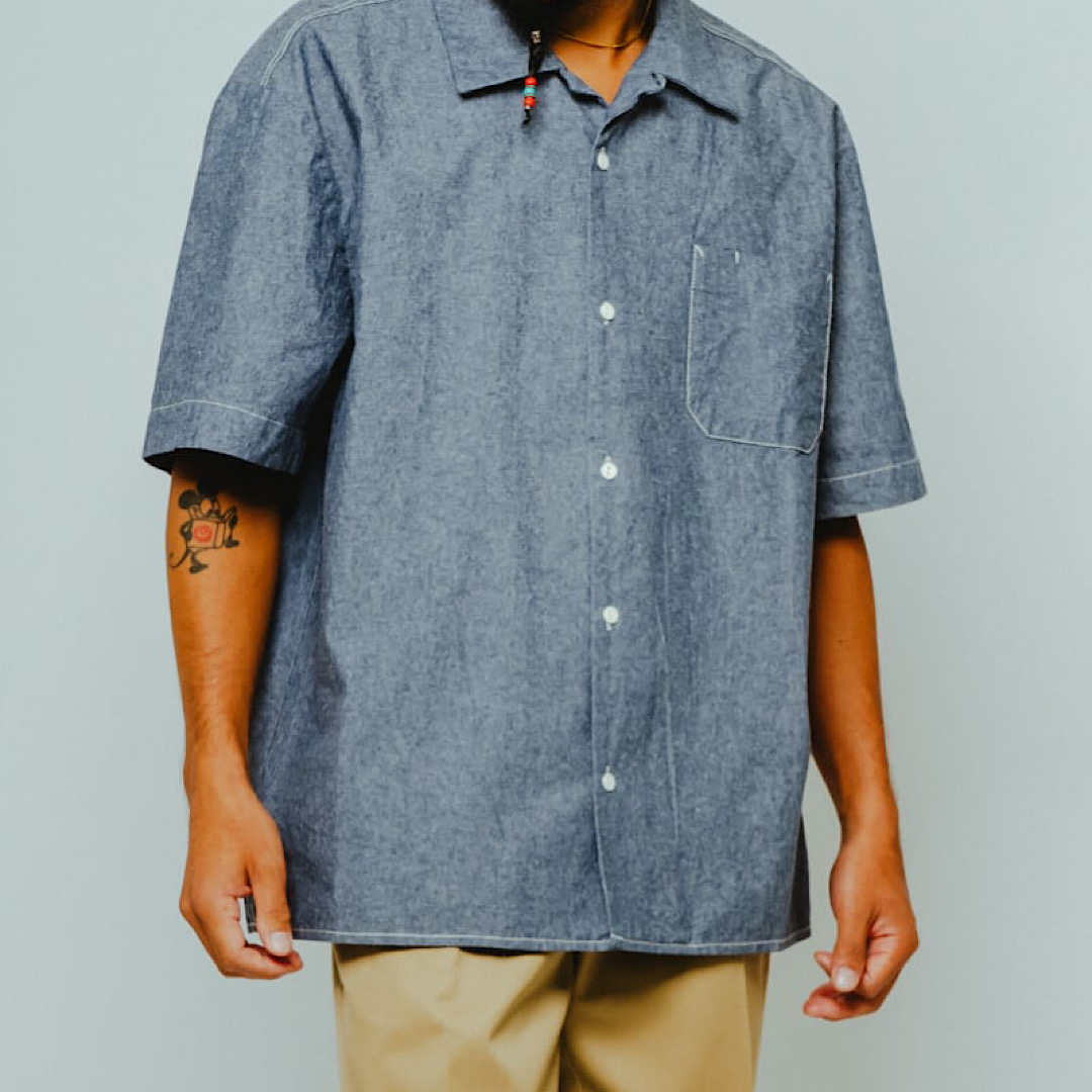 首元を締め付けない開放的なオープンカラーと、風通しの良いシャンブレー生地を組み合わせ、見た目にも着心地にも涼しさを確保。ヴィンテージワークウェアの土臭さを残しつつ、霜降り調のブルーが清潔感のある夏スタイルを演出します。