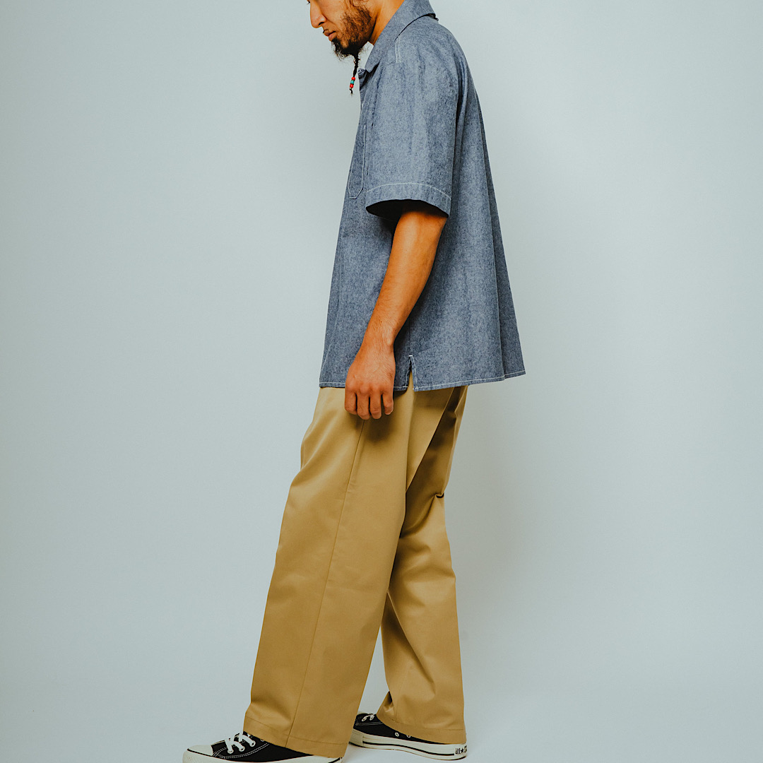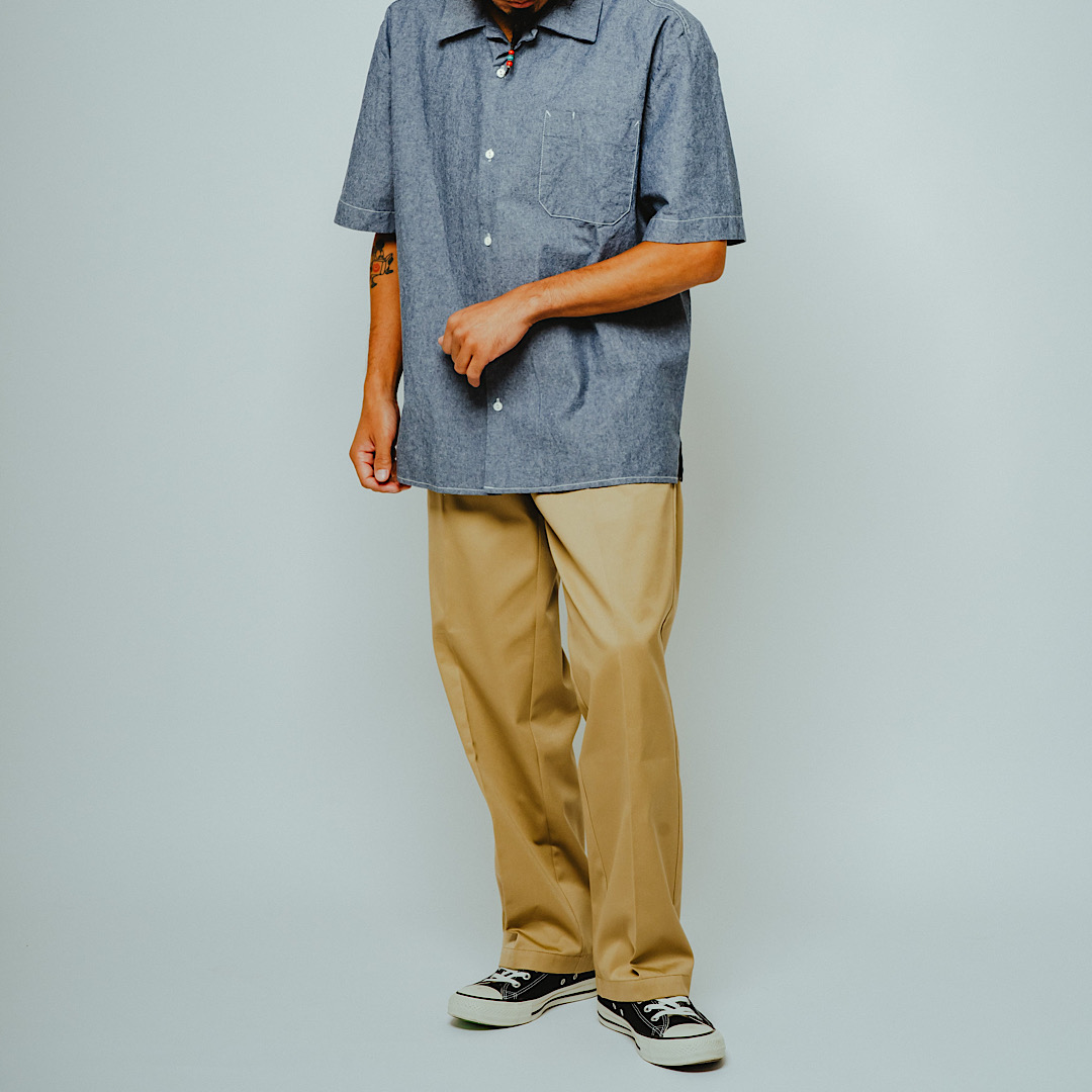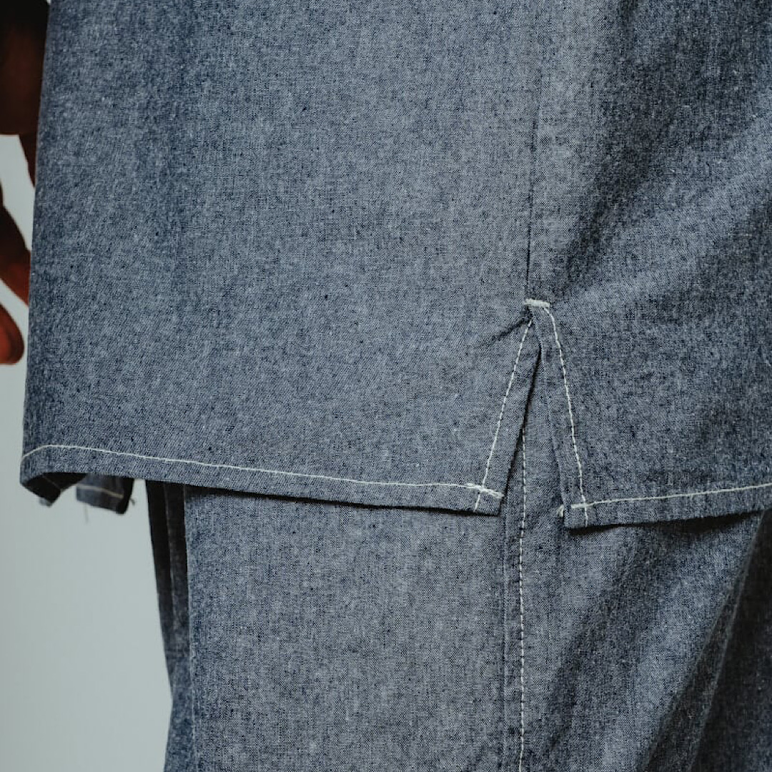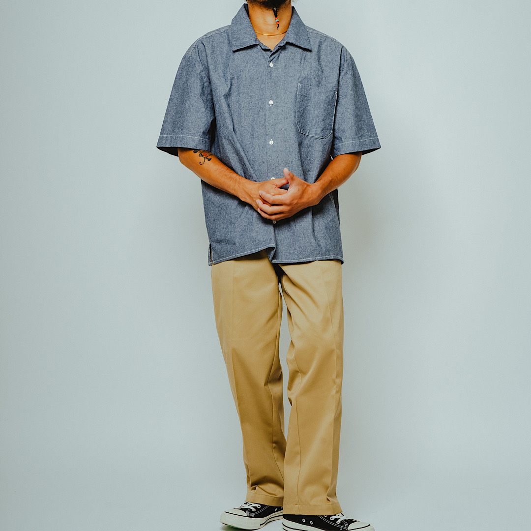 首元を締め付けない開放的なオープンカラーと、風通しの良いシャンブレー生地を組み合わせ、見た目にも着心地にも涼しさを確保。ヴィンテージワークウェアの土臭さを残しつつ、霜降り調のブルーが清潔感のある夏スタイルを演出します。