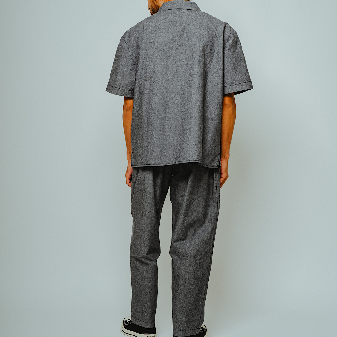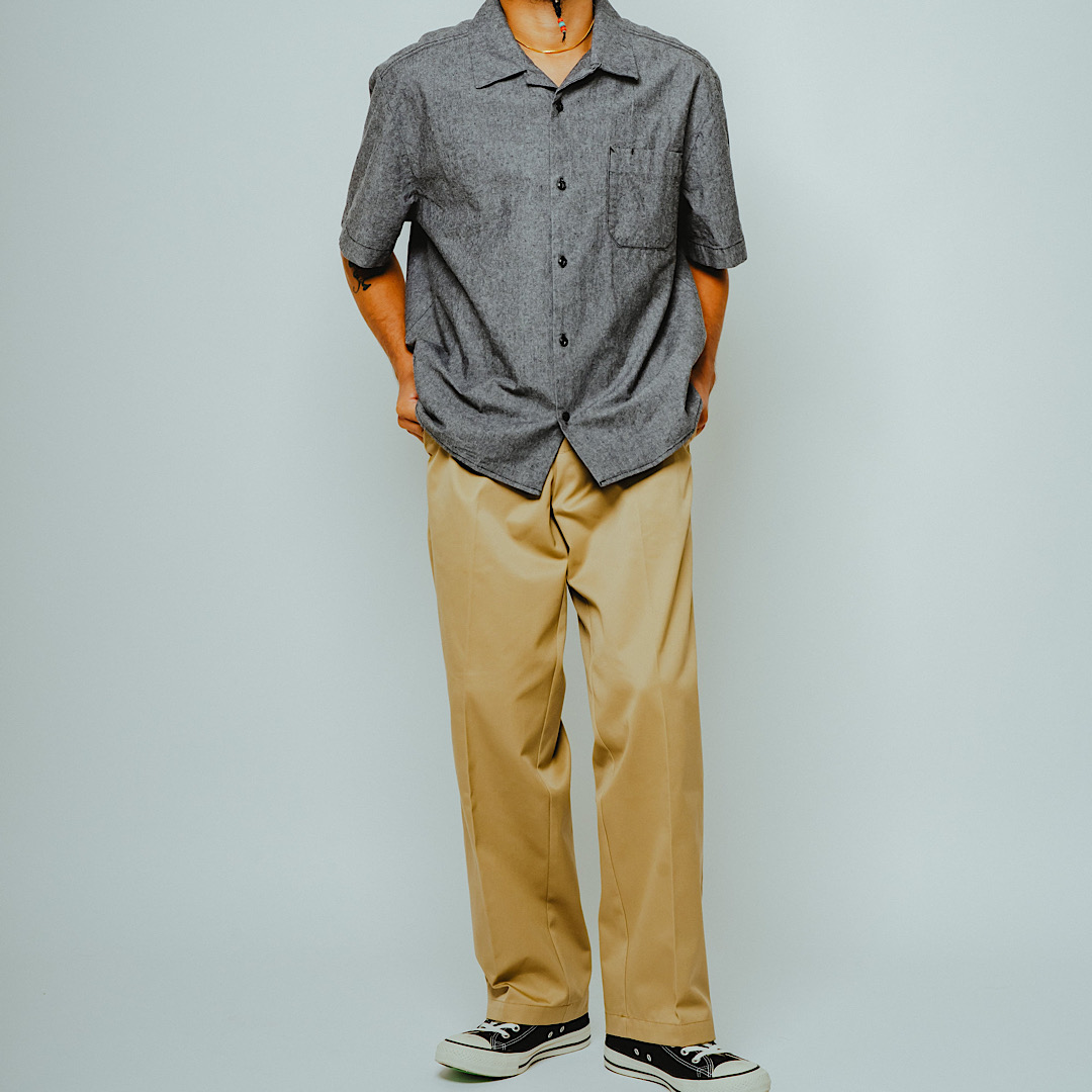 首元を締め付けない開放的なオープンカラーと、風通しの良いシャンブレー生地を組み合わせ、見た目にも着心地にも涼しさを確保。ヴィンテージワークウェアの土臭さを残しつつ、霜降り調のブルーが清潔感のある夏スタイルを演出します。