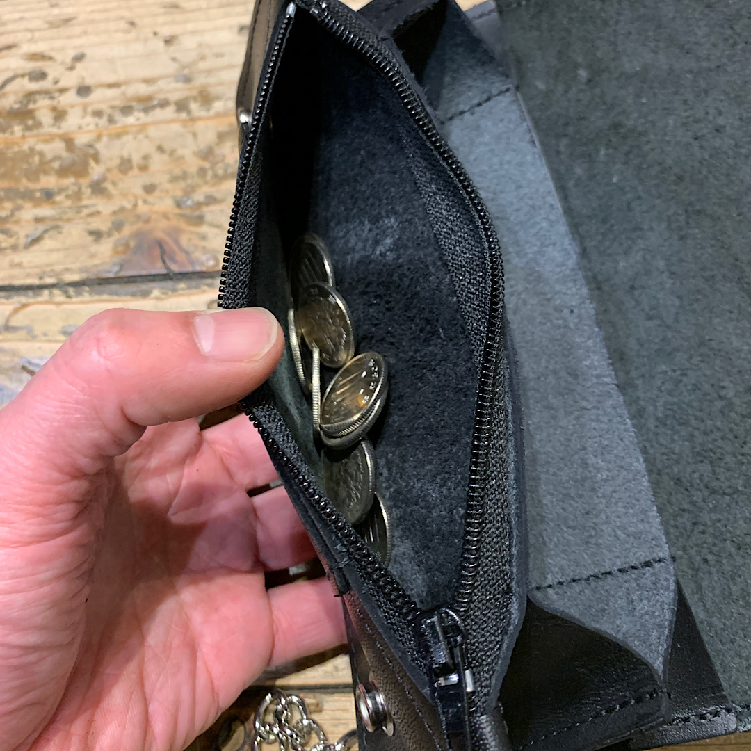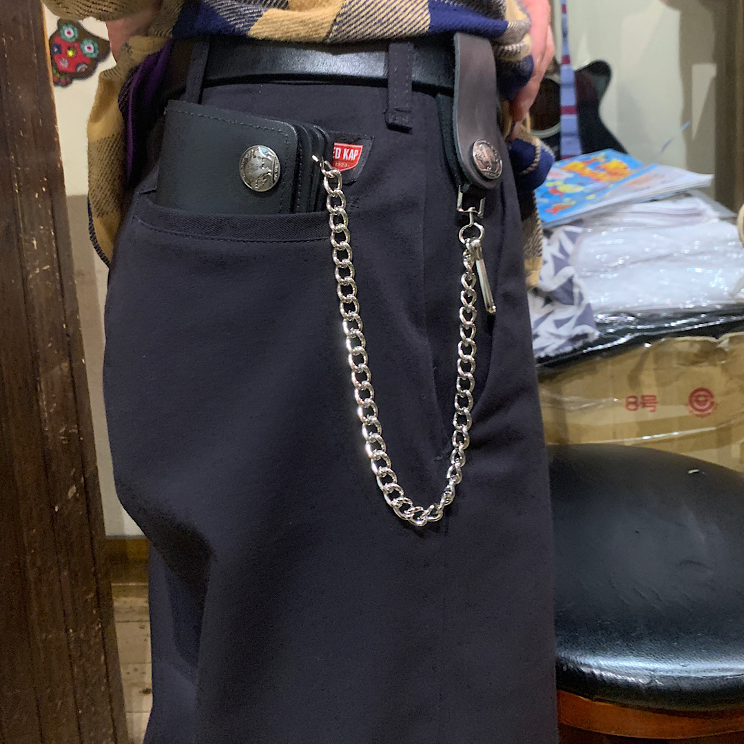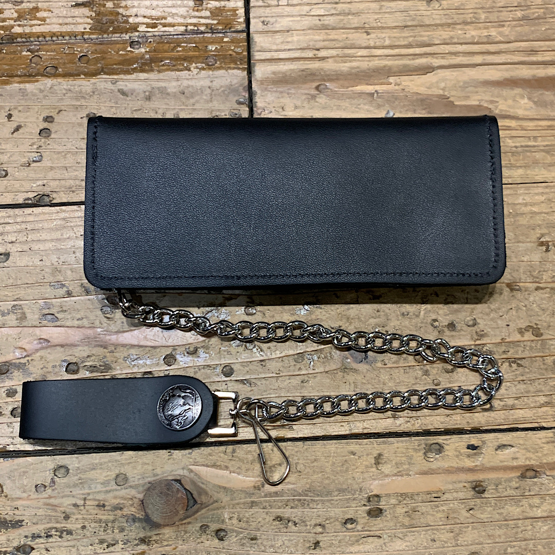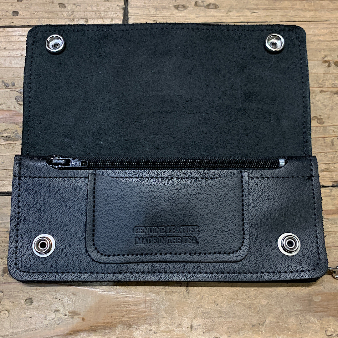 アメリカ製でありながらも醸し出すチープな雰囲気は、当時のアウトロー達から愛されたリアルなアメリカンスタイルそのものです。ジッパー付きの小銭入れに2層のお札入れ、その間と前面のカード入れというシンプルかつクラシックなデザインとなっており、少し華奢なチェーンはどんなスタイルでも邪魔をせず、取り入れ易い逸品となっています。